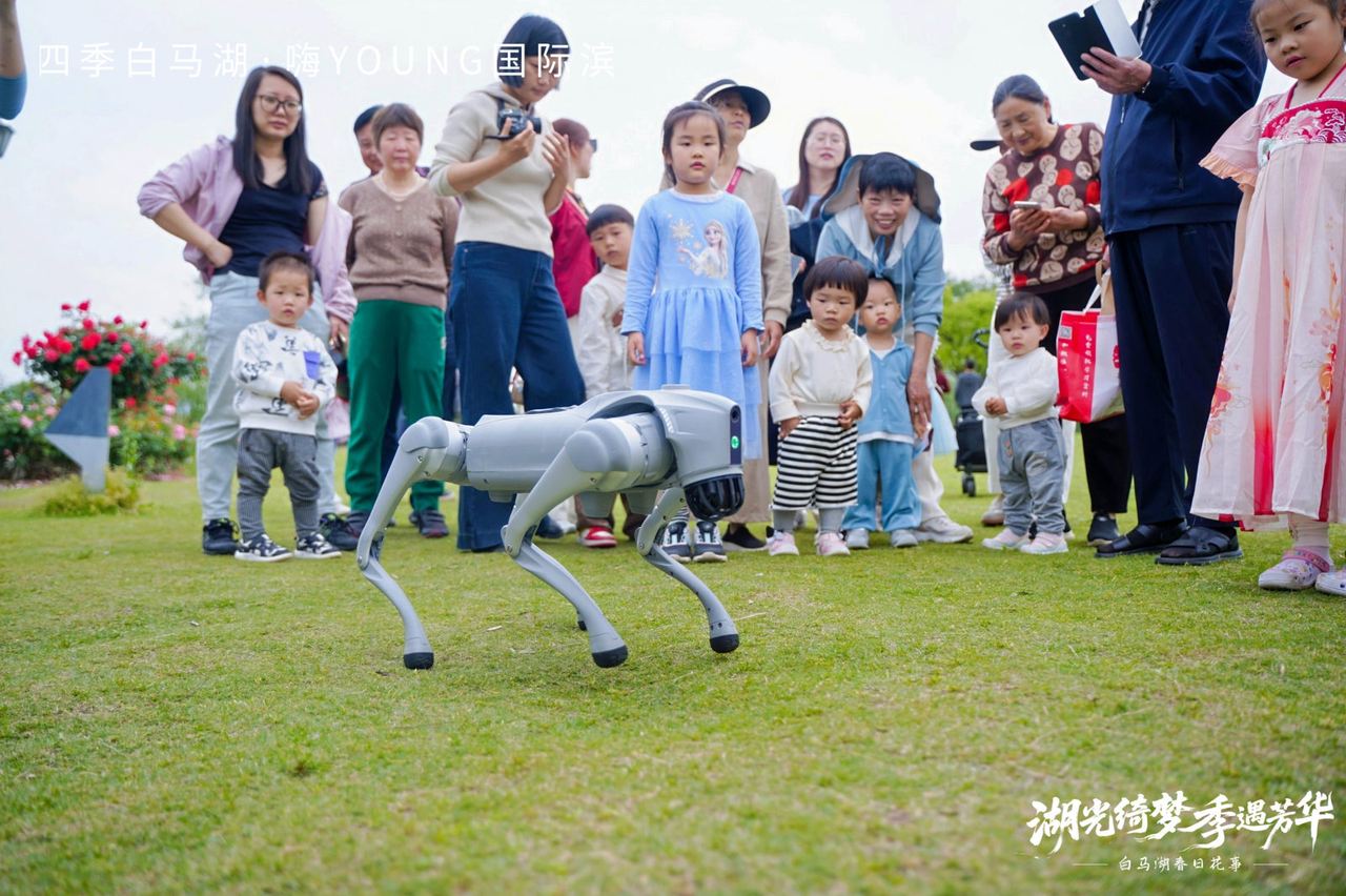 暖场环节中,智能机器狗与儿童趣味互动欢乐满满。满满的科技元素为传统赏花活动也注入了新鲜活力。