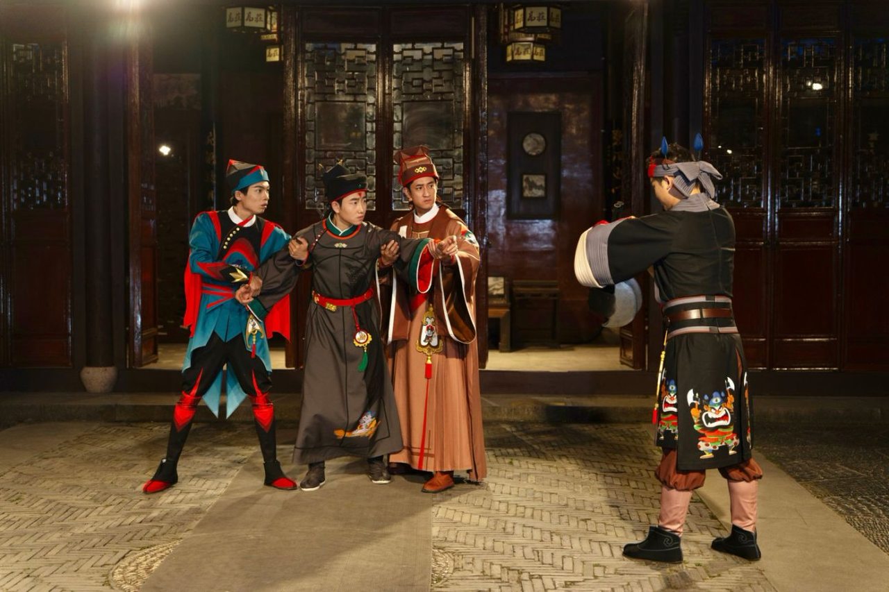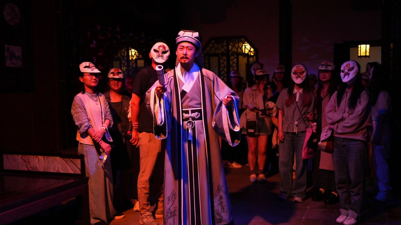 值得一提的是,演出前每个观众都能领到蔡志忠所绘“水浒108将”的卡通面具,戴上就可沉浸式化身追随英雄足迹的“剧中人”。演出中,观众将身处宛如镜花水月的场景中,跟着角色去触发新的故事线。回廊间,有辗转腾挪;角落里,有窃窃私语;水榭边,有倩影惊鸿。曾经一步一景的江南园林,成为移步异景的奇妙世界。现场一位00后观众感慨:“从未体验过如此沉浸的演出,把灵秀雅致的江南园林当做舞台,他们(演员)站在我面前,让我切身感受到梁山好汉的快意恩仇,就像从画里走出来一样。”