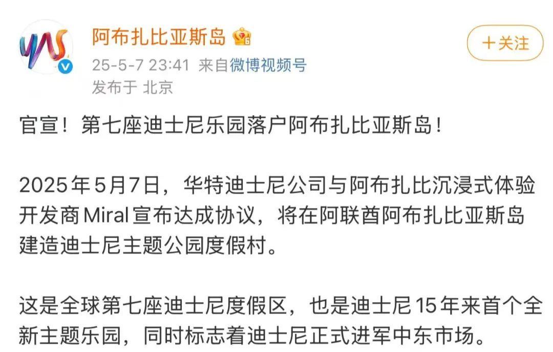 官宣了!世界第七座迪士尼要来啦!华特迪士尼公司宣布将与阿联酋一家地产开发商合作在该国首都阿布扎比建造一座迪士尼主题公园。