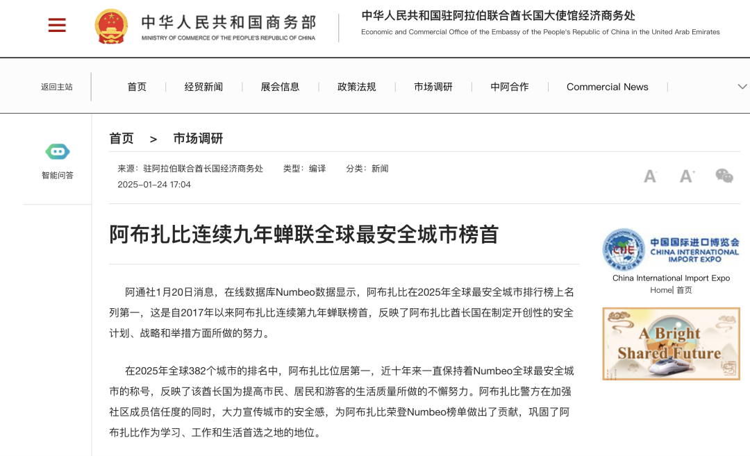 阿通社1月20日消息,在线数据库Numbeo数据显示,在2025年全球382个城市的排名中,阿布扎比在“2025年全球最安全城市”排行榜上名列第一,并且这是自2017年以来,阿布扎比连续第九年蝉联榜首,近十年来一直保持着。