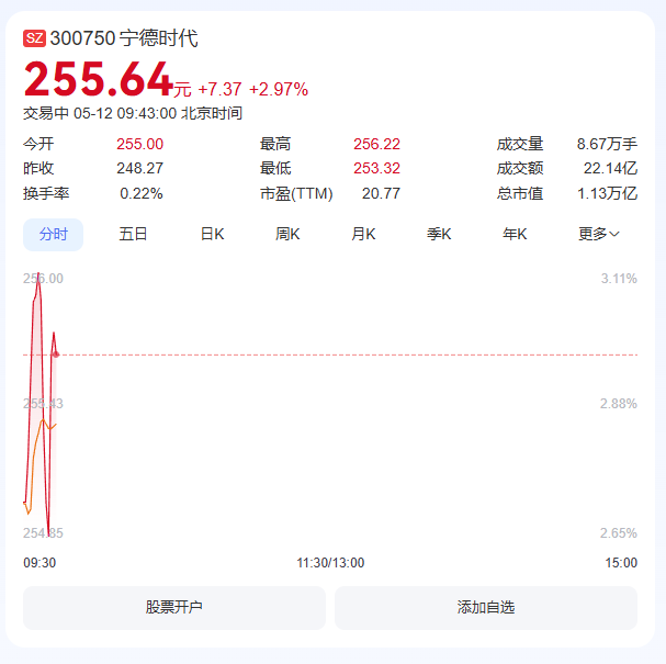 受此消息影响,宁德时代A股开盘大涨。截至发稿,宁德时代报255.64元/股,涨2.97%,总市值达1.13万亿元。