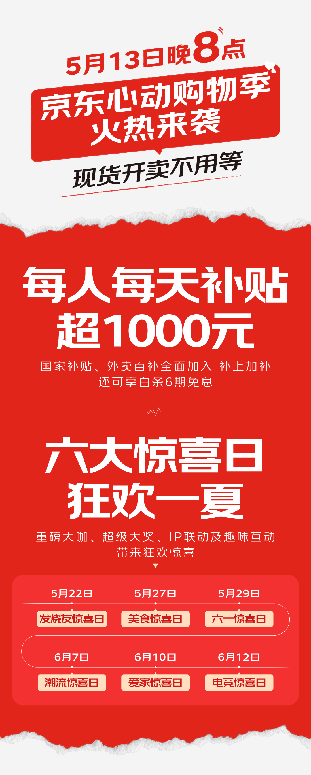 京东今年不仅现货开卖,推出“满200减20神券”“跨店满减”“官方立减”等促销玩法,还首次整合国家补贴与京东外卖百亿补贴等资源“补上加补”,并通过更多重磅大咖参与、超级大奖赠送、IP联动及趣味互动,重点打造的六大惊喜日活动会横跨心动购物季和京东“6·18”两大购物季。(详情请戳《定了!5月13日晚8点起,京东心动购物季和京东618纷至沓来》)