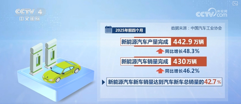 数据显示,2025年前4个月,中国汽车产销量历史上首次双双突破1000万辆,同比增长均超过10%。新能源汽车继续保持高速增长,前4个月,新能源汽车产销量分别完成442.9万辆和430万辆,同比分别增长48.3%和46.2%,新能源汽车新车销量达到汽车新车总销量的42.7%。前4个月,新能源汽车出口64.2万辆,同比增长52.6%。