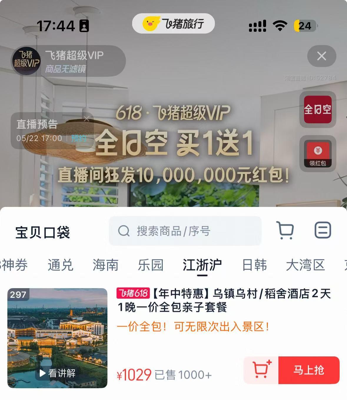 打开飞猪618活动专场,乌镇乌村售价1000余元的2天1晚亲子套餐(2名成人+1名小孩)已卖出1000多份,端午假期全被约满;西塘古镇内的汉服旅拍店,距离月底还有10天,但高峰期已被约满……