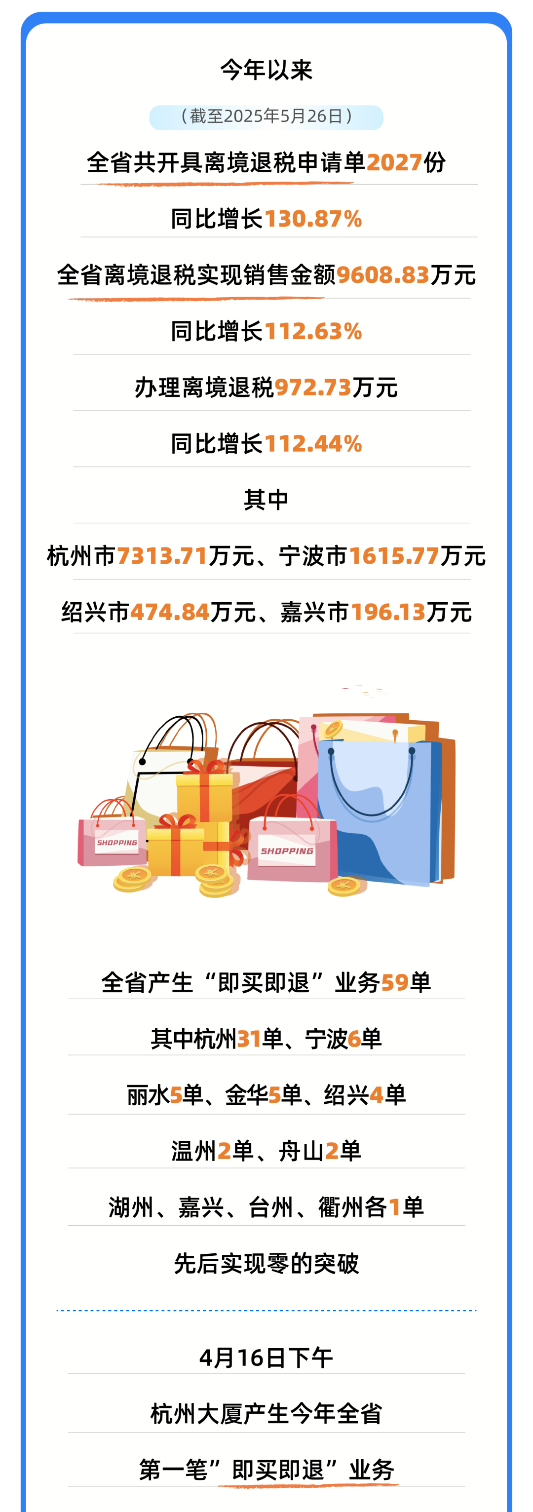 据悉,浙江正在大力拓展“即买即退+便捷支付”场景,升级全省离境退税系统,商户在开退税申请单时可直接导入发票数据,进一步压缩离境退税办理时间。与支付宝、浙商银行合作,实现离境退税便捷支付,对于安装了支付宝国际版的旅客,在自助办理终端退税时,可以减省绑定银行卡环节,实现退税款实时到账、全天24小时随时可办。