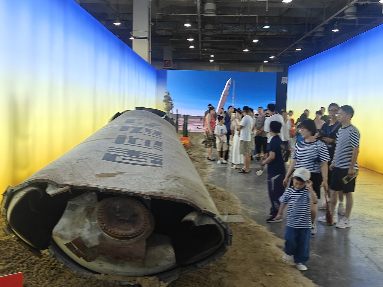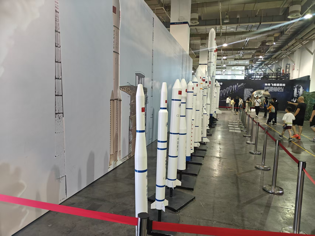 航天展区堪称“太空博物馆”。1:1的天和核心舱模拟舱还原航天员“太空之家”,观众可触摸操作台体验太空生活;长征2F火箭大型模型巍然矗立,见证中国航天的腾飞之路;“星落”艺术展区通过灯光与沙场组合,再现火箭残骸坠落的震撼瞬间。更有星河动力谷神星一号火箭实物残骸,展现中国商业航天的迅猛发展。