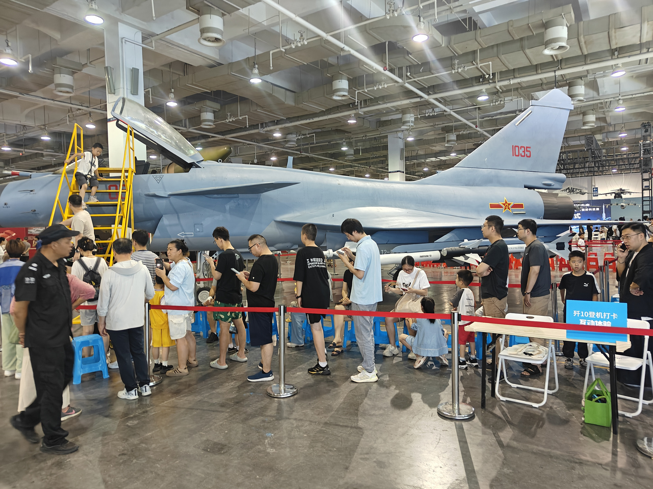 记者在展会现场看到,1:1比例的“歼-20战斗机”“歼-10战斗机”“武直10”等空军主力装备模型震撼亮相,观众争相登上驾驶舱,体验“驾驭”战机的豪情;99A主战坦克、红旗2地对空导弹等陆军利器一字排开,展现我国战略威慑力量的雄厚实力;辽宁舰航母战斗群沉浸式空间,更是让观众仿佛置身波涛汹涌的远海。