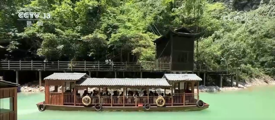 乘船赏景也成为景区一大特色,游客们乘坐游船缓缓穿梭于澄澈的湖面上,四周峡谷青山环抱,石壁瀑布倾泻而下,两岸景色蔚为壮观。微风拂来,吹散夏日的燥热,让人沉浸在如诗如画的美景中,心旷神怡。
