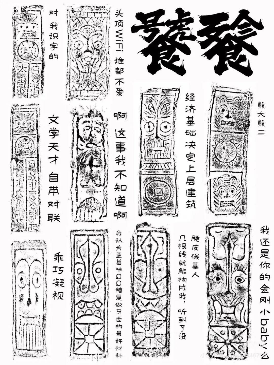 除了萌趣的人物纹样,古砖上威严的饕餮,也是马雨的“心头好”。她曾顺着这些纹样的线条,将饕餮形象拓印下来,设计出一整套表情包。