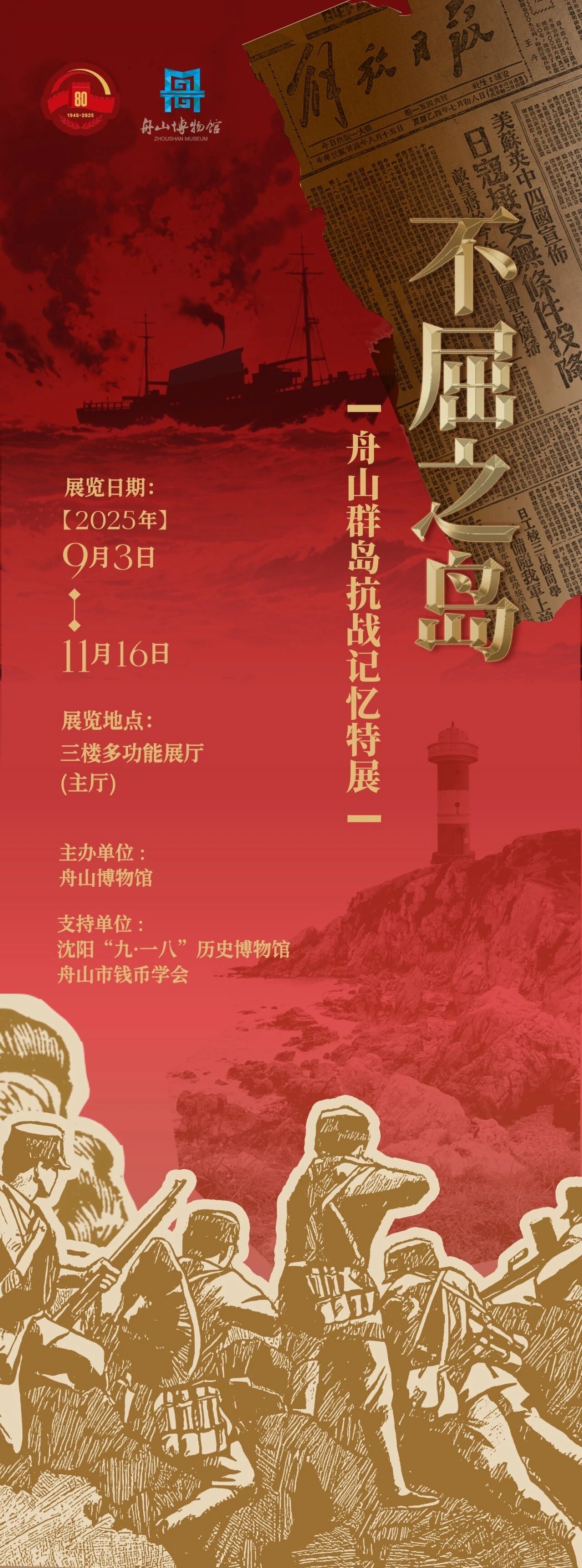 展览简介:八十载岁月荏苒,那段血与火凝铸的不屈抗争史不容遗忘,那份用生命捍卫的正义理应传承。此次展览循着历史的足迹,和观众一起追忆那段被血与火刻下的记忆。我们回望悲壮,亦为传承,愿今日之舟山,倾听昨日回响;愿今日之我们,不忘先辈之誓。