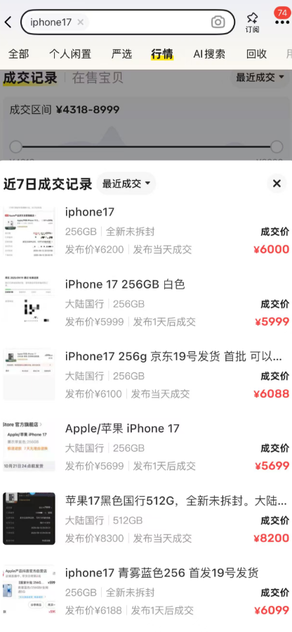通过闲鱼展示的近7日成交记录可以看到,绝大多数iPhone17 256G标准版的成交价,与正在挂牌销售的iPhone 17 256G标准版接近,且大多都低于了其“发布价”,有一笔订单的发布价格为6200,最后以6000成交。