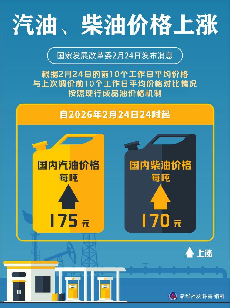 国家发展改革委24日发布消息,近期国际市场油价波动上升,根据2月24日的前10个工作日平均价格与上次调价前10个工作日平均价格对比情况,按照现行成品油价格机制,自2月24日24时起,国内汽、柴油价格每吨分别上涨175元和170元。