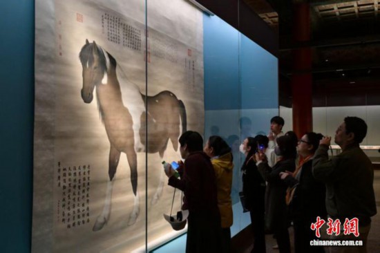 “神骏:故宫书画艺术中的马世界”展览4月21日在故宫博物院文华殿开幕,图为展览现场。中新社记者田雨昊摄